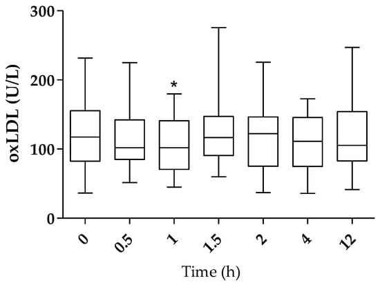 Figure 1 shows box plots representing the oxLDL content pre-intervention and up to 12 h after intake (as the sum of IP-1 and IP-2, n = 25). The baseline plasma oxLDL levels resulting were highly variable between subjects (125.5 ± 10.49 U/L), as well as highly intra-variable (data not shown). As shown in Figure 1, a downward trend in oxLDL levels was observed after ingestion for up to 12 h, although this trend reached statistical significance after 1 h only (108.0 ± 8.66 U/L, p < 0.05).