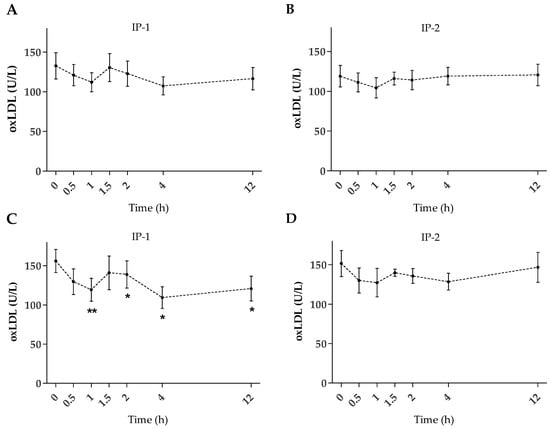 Interestingly, when the statistical analysis is stratified to include only the subjects with a high level of oxLDL pre-intervention (cut off 101 U/L) that is, basal mean values higher than reported for healthy subjects [], the oxLDL level pre-intervention (155.89 ± 14.75 U/L, n = 9) was significantly reduced at 1 h (119.46 ± 14.62 U/L, p < 0.01) after intake of IP-1 only (Figure 2C), remaining significantly reduced (p < 0.05) at 2, 4, and 12 h post-intervention.