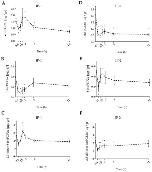 Mean urinary IsoPs content over time, before (0 h) and after ingestion of IP-1 (A–C) and IP-2 (D–F). Bars: SEM. Significantly different versus baseline with *: p < 0.05, and **: p < 0.01.