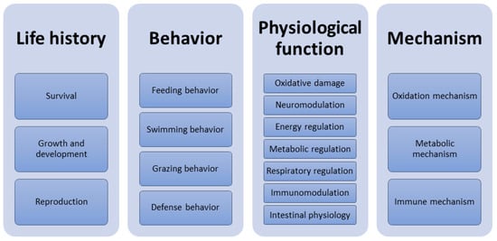 The carbohydrate storage [], fatty acid content and composition [], essential amino acid content [], carbon budget [], energy balance [], lipid stores [] and protein content [] could be used to evaluate the energy regulation. PS beads increased the energetic losses in C. helgolandicus [], PS spheres caused changes in fatty acids and essential amino acids in L. vannamei [] and PS fragments had more significant effects on the reduction in carbohydrate and protein energy storage on D. magna than beads []. Moreover, 300 μg/L PE more significantly reduced the ratios of protein, carbohydrates, lipids and caloric contents in M. monogolica than 100 μg/L PE [], and mixtures of PE and Cd caused a more obvious energy drop than PE []. The PP fibers affected the energy balance in C. maenas [] and reduced the stored lipids in Nephrops norvegicus []. PET significantly increased the energy consumption in D. magna when co-existed with Ag or Ag. Nylon fibers induced the higher lipid accumulation than nylon granules in C. finmarchicus [].