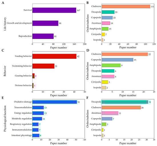 The number of papers on the effects of microplastics on the life history, behavior and physiological function of aquatic crustacean. The number of papers examining the life history, behavior and physiological function of aquatic crustacean impacted by microplastics are shown in (A,C,E), respectively. The number of papers on aquatic species involved in the life history, behavior and physiological function of aquatic crustacean are shown in (B,D,F), respectively.