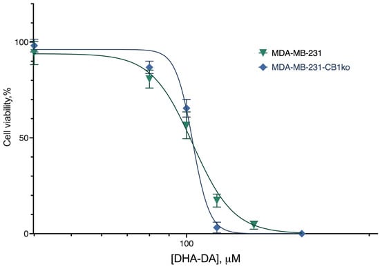 The effect of CB1 knockout on DHA-DA cytotoxicity. Incubation 24 h, MTT test, mean ± standard deviation (n = 7 experiments).