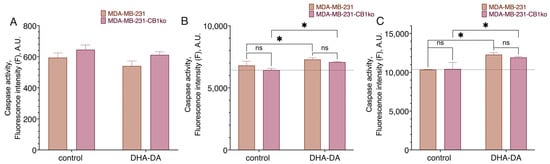 Effect of DHA-DA (40 µM) on the caspase activation in the MDA-MB-231 cell line after CB1 receptor knockout. A total of 3 h incubation time: fluorogenic substrate measurement data. (A) caspase 8, (B) caspase 9, (C) caspase 3; *, a statistically significant difference from the control without substance in the ANOVA test with the Holm–Sidak post-test; ns, not significant.