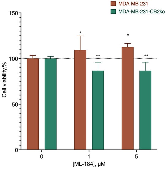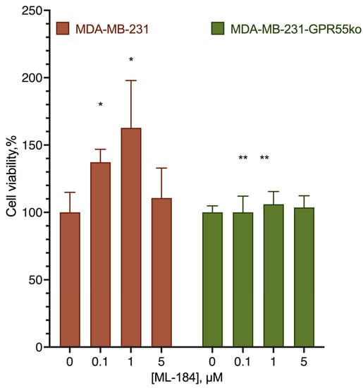 Effect of ML-184 on MDA-MB-231 cell lines knockout for the GPR55 receptor. *, a statistically significant difference from the control without substance; **, a statistically significant difference from the same concentration of the substance on the original cell line in the ANOVA test with the Holm–Sidak post-test.