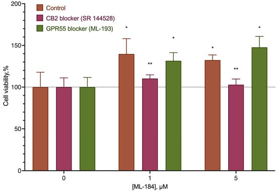 The effect of ML-184 on the original cell line against the background of GPR55 (ML-193) and CB2 (SR 144528) blockers. *, a statistically significant difference from control without ML-184; **, a statistically significant difference from the substance without blocker, and ANOVA with Holm–Sidak post-test.