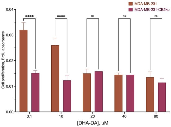 Effect of DHA-DA on the MDA-MB-231 proliferation after the CB2 receptor knockout. Delipidated serum, 72 h incubation time, BrdU proliferation kit data; ****, a statistically significant difference from the same concentration of the substance on the original cell line in the ANOVA test with the Holm–Sidak post-test; ns, not significant.