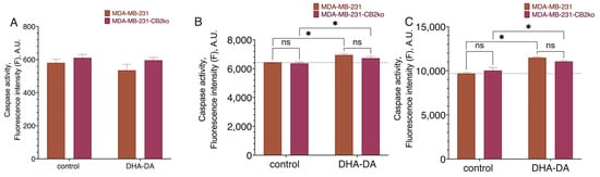 Effect of DHA-DA (40 µM) on the caspase activation in the MDA-MB-231 cell line after CB2 receptor knockout. A total of 3 h incubation time fluorogenic substrate measurement data: (A) caspase 8, (B) caspase 9, (C) caspase 3; *, a statistically significant difference from the control without substance in the ANOVA test with the Holm–Sidak post-test, ns, not significant.