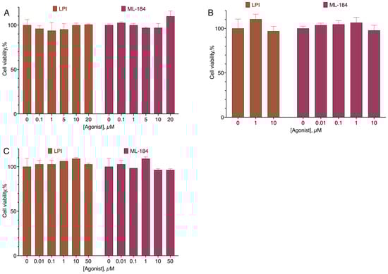 Effect of ML-184 and LPI on cell lines without the CB2 receptor expression. (A) Mia PaCa 2, (B) RPMI-8226, (C) Hep G2. Incubation time 72 h, MTT test data, mean ± standard error. The differences were not statistically significant. Amalgamated data of n = 4 experiments.