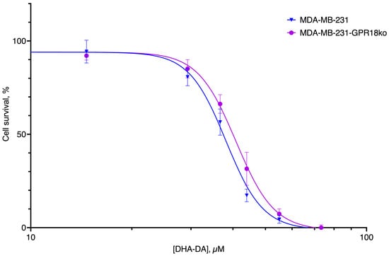 Cytotoxicity of DHA-DA for the original line MDA-MB-231 and the variant with knockout GPR18, incubation time 24 h, MTT test data. Pooled data from 7 experiments; mean ± standard error.