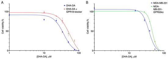 GPR18-GPR55 interaction in the DHA-DA cytotoxicity. (A) Cytotoxicity of DHA-DA for the original line MDA-MB-231 with and without the GPR18 blocker PSB CB5 (3 µM). (B) Cytotoxicity of DHA-DA for the original line MDA-MB-231 and the variants with knockout GPR55, incubation time 24 h, MTT test data. Pooled data from 7 experiments; mean ± standard error.