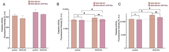 Effect of DHA-DA (40 µM) on the caspase activation in the MDA-MB-231 cell line after GPR18 receptor knockout. A total of 3 h incubation time for fluorogenic substrate measurement data. (A) caspase 8, (B) caspase 9, (C) caspase 3; *, a statistically significant difference from the control without substance; **, a statistically significant difference from the same treatment of the native cell line, p ≤ 0.05, in the ANOVA test with the Holm–Sidak post-test, ns, not significant.