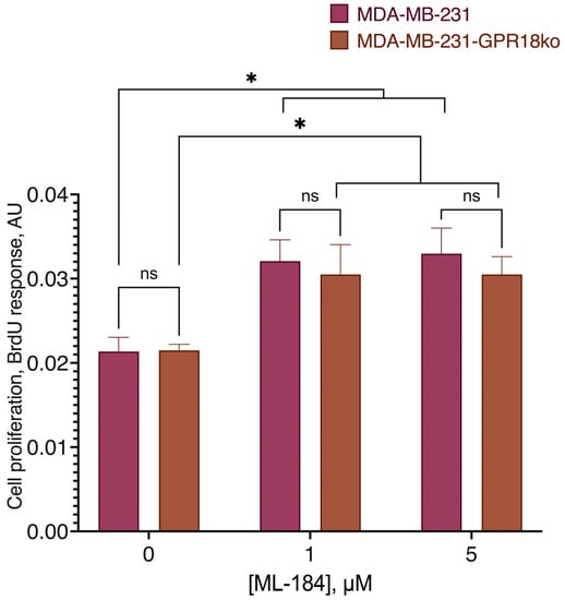 Comparison of the GPR55 agonist ML-184 activity on the original cell line and the line knocked out at the GPR18 receptor. *, a statistically significant difference from the control without the substance in the ANOVA test with the Holm–Sidak post-test, ns, not significant.