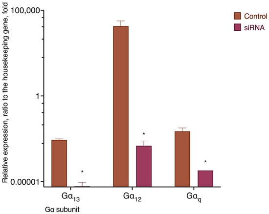 To optimize the conditions, two variants of transfecting agents were used (Thermo RNAiMax and Thermo Lipofectamine 3000, the latter in two addition variants, 0.75 and 1.5 µL per well of a 24-well plate, respectively). For Gα13, the use of RNAiMax turned out to be optimal; for the remaining two Gα, Lipofectamine 3000 in variant 20 was optimal. Under optimal conditions, RNA expression of each of the subunit’s gene was not recorded after 72 h of incubation with siRNA.