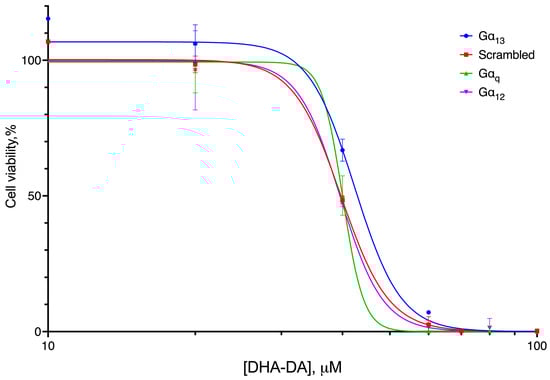 Cytotoxicity of DHA-DA for the MDA-MB-231 line with the knockdown of Gα subunits. The cells were treated for 72 h after siRNA transfection; incubation with the substance was for 24 h. MTT test data.