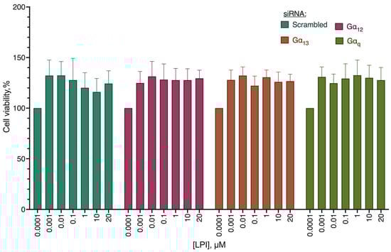 As far as the second mode of action for the GPR55 receptor is the induction of proliferation, we evaluated the activity of its known pro-proliferative ligand LPI on the Gα subunit knockdowns (Figure 17). No significant difference from the cells transfected with the scrambled siRNA control was observed, indicating the absence of a preferred role of a particular Gα subunit in the pro-proliferative activity induction via the GPR55 receptor.