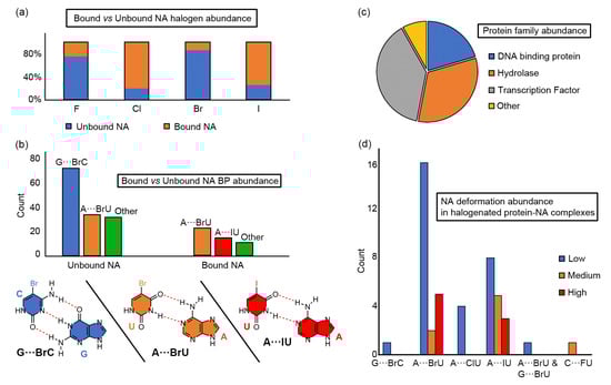Statistical results from the PDB survey. (a) Bound vs. unbound NA halogen abundance, (b) bound vs. unbound (to a protein) NA BP abundance, (c) protein family abundance, and (d) NA deformation abundance in halogenated protein-NA complexes.