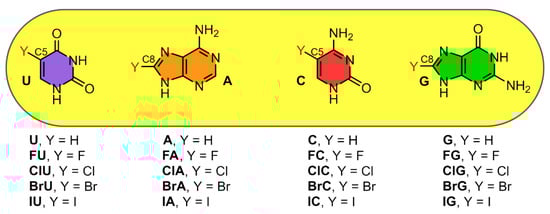 Schematic representation of the nucleobases Uracil (U), Adenine (A), Cytosine (C), and Guanine (G) and their corresponding halogenated derivatives at the C5 and C8 positions used in this study.