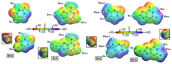 Molecular Electrostatic potential (MEP) surfaces of bromouracil (BrU), bromocytosine (BrC), bromoadenine (BrA), and bromoguanine (BrG). The σ-hole present in the halogen atom (Br as example) is magnified inside the square parts of the figure. The white asterisk indicates where the electrostatic potential value was evaluated (see also Table 1 and Table 2). Surfaces created using an isovalue of 0.001 a.u.