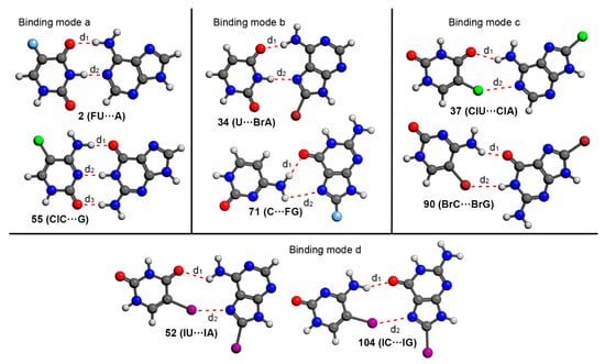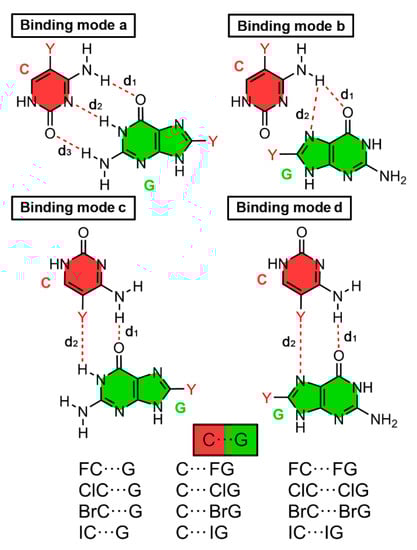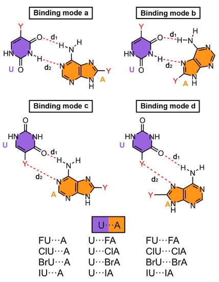 As noticed in Figure 4, we considered four main different binding modes. Binding modes a and b involve two main HBs and represent the classical Watson-Crick and Hoogsteen interaction patterns, respectively. On the other hand, binding modes c and d were proposed to evaluate the stability of halogenated BPs where both hydrogen bonding and halogen bonding interactions coexist (one HB and one HalB per BP).