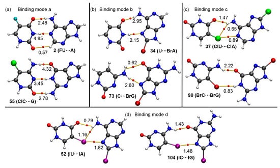 Among the four studied binding modes (Figure 6), binding modes a and b (involving the Watson-Crick and Hoogsteen faces of G) rely on three and two HBs, respectively. On the other hand, binding modes c and d are based on a combination of one HB and one HalB, respectively, similarly to that for the U···A BP shown above. All of the complexes studied exhibited a negative and moderately strong binding energy values, comprised between −29.3 to −7.1 kcal/mol. Similarly to that for the U···A BP, complexes involving binding modes c and d (79 to 104, implicating two HBs or one HB and one HalB) obtained lower binding energy values than those complexes involving binding modes a and b (53 to 78, involving three and one HBs), thus being the latter preferred over the other non-canonical interaction modes.