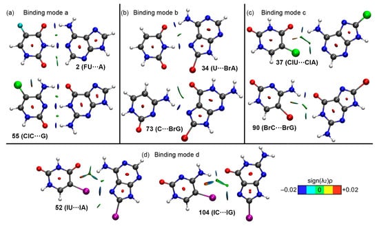 In the case of complexes 34 and 73 (Figure 7b—binding mode b, representing the Hoogsteen base pairing), two BCPs and bond paths characterized them. First, in complex 34, two BCPs involved (i) a sp2 O atom from U and the amino group from BrA and (ii) a NH group from U and a sp2 N atom from BrA. On the other hand, in complex 73, a double HB was characterized by the presence of two BCPs and bond paths which involved the amino group of C as HB donor moiety and a sp2 O and N atoms acting as HB acceptor entities. Interestingly, the NCIplot analysis revealed that in complex 34 both HBs equally participate in the stability of the complex, as indicated by the blue isosurface located between both molecules (see Figure 8b). However, the opposite was observed in the case of complex 73, where the HB established between the NH2 group of C and the N atom of BrG exhibited a bluish isosurface (denoting a stronger NCI), while the other HB showed a greenish isosurface between both moieties, therefore accounting for a weaker interaction.