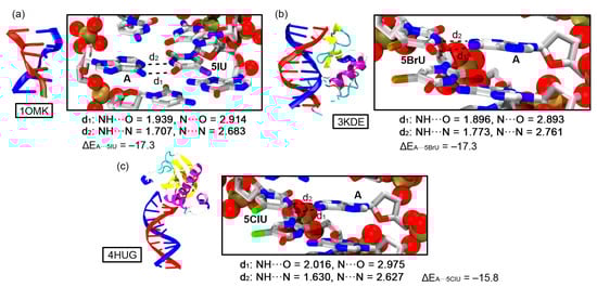 As the final stage of our study, we selected several representative examples from the PDB search and evaluated the stability of halogenated BPs (three of them are shown in Figure 9). The selected examples involved a distorted DNA structure (Figure 9a, PDBID: 1OMK) [] corresponding to the first antiviral nucleoside 5-iodo-2’-deoxyuridine (IDU) against herpes simplex virus type 1 and type 2 and two protein-DNA complexes, which involve a THAP-family C(2)CH zinc-coordinating DNA-binding protein (Figure 9b, PDBID: 3KDE) [] and the Bacillus halodurans RNase H (Bh RNase H) protein (Figure 9c, PDBID: 4HUG) [].