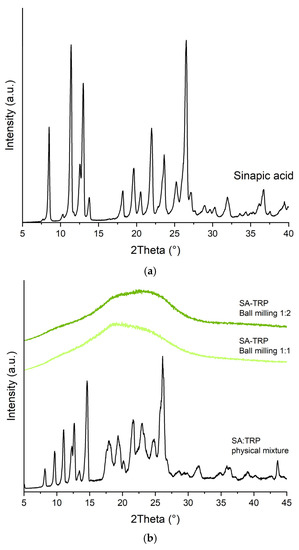 Therefore, work on improving the solubility of SA is warranted. Sinha et al. [14] obtained co-crystals of SA with nicotinamide, while Ahad et al. [15] prepared an inclusion complex of SA with hydroxypropyl-β-cyclodextrin (HPβCD) by means of a solvent evaporation technique. With the addition of HPβCD, the solubility of SA improved. In the presence of HPβCD, the aqueous solubility of another hydroxycinnamic acid, trans-ferulic acid, was also significantly increased [9]. Various other techniques and methods have been used to improve the water solubility of phenolic acids, for example, the preparation of electrospun nanofibers [16,17], encapsulation using spray drying [18], and amorphous solid dispersions [19].