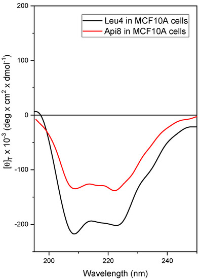 CD profiles of Leu4-NH2 and Api8-NH2 acquired at 25 °C in the presence of MCF-10A epithelial breast cells. (Peptide concentrations: Api8, 5 × 10−5 M; Leu4, 1 × 10−5 M).