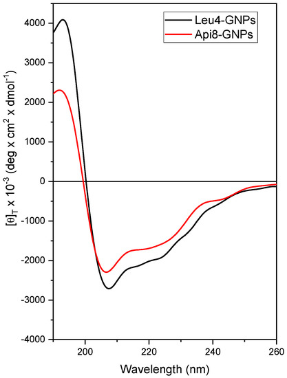 CD profiles of GNPs after decoration with Leu4-SH or Api8-SH, acquired at 25 °C in H2O (peptide-GNP concentration: 10−6 M).