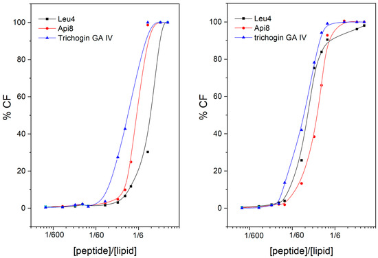 As expected, the peptides are able to cause membrane leakage with subsequent release of the fluorescent dye almost as effectively as the parent peptide trichogin GA IV. The results are in line with the literature on Leu4-Lol [27]. This result allowed us to conclude that both peptides retain the ability to interact with model membranes of the parent peptide. Leakage experiments cannot be performed on FITC-containing peptides since fluorescence from FITC interferes with that from the CF release.