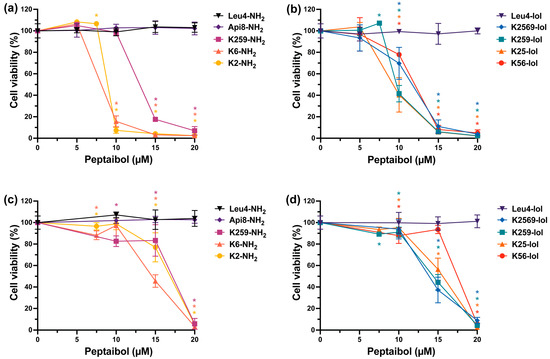 Leu4-NH2, Api8-NH2 and Leu4-Lol did not significantly affect the viability of both cell lines in the peptide concentration range tested (Figure 4). For all the other peptaibols, a concentration-dependent cell viability reduction was observed. The cytotoxicity is higher against the cancer than the normal cell line, as reflected by the calculated IC50 values (Table 3). Indeed, while the IC50 values measured in MDA-MB-231 cells are in the concentration range 8–12 µM (with the exception of K259-NH2, with an IC50 of about 13 µM), viability in MCF-10A cells did not drop below 50% for any of the peptides tested in the aforementioned concentration range. Of note, the IC50 values on normal cells are 5 µM higher than those measured in cancer cells. We note that none of the peptaibols were found cytotoxic against epithelial breast cells up to 10 µM, while in cancer cells most of them exerted significant viability reduction (killing activity of about 90% for K6-NH2 and K2-NH2, 60% for K259-Lol and K25-Lol, 30% for K2569-Lol, 20% for K56-Lol). This result is in line with the observation that K6-NH2 is taken up faster by ovarian cancer (OvCa) and Hodgkin lymphoma (HL) cell lines than normal cells [28]. Generally, the C-terminal moiety does not seem to significantly impact on peptide cytotoxicity, the effect of -NH2 or -Lol analogs being quite comparable. Again, this observation confirms and broadens the significance of the data reported for K6-Lol and K6-NH2 on OvCa and HL cell lines [28]. The cost-effective amino alcohol-to-amide substitution at the peptide C-terminus can therefore be considered conservative in terms of cytotoxic activity.