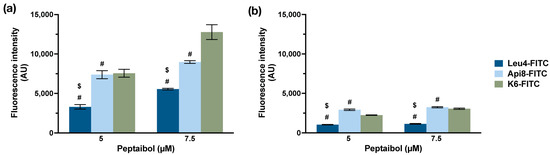 Flow cytometry measurements of FITC-conjugated peptaibols in MDA-MB-231 (a) and MCF-10 (b) cells after a 24 h incubation period. Data are expressed as mean percentage ± SD of at least two independent experiments, carried out in triplicate. #: p < 0.05, significantly different from K6-FITC, $: p < 0.05, significantly different from Api8-FITC (two-way ANOVA with Bonferroni′s correction).