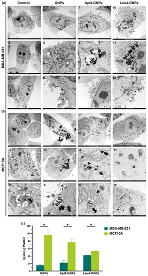 TEM images acquired at different magnifications of MDA-MB-231 (a) and MCF-10A (b) cells incubated for 24 h with free GNPs, Api8-GNPs, or Leu4-NPs. Scale bars: 5 µm, images (a1)–(a4), (a7), (a10), (b1), (b2), (b4), (b5), (b7), (b10); 2 µm, images (a9), (a11), (b12); 1 µm, images (a5), (a6), (a12), (b3), (b8), (b9), (b11); 500 nm, images (a8), (b6). (c) Uptake of the GNP formulations measured by atomic absorption spectrometry (AAS). The quantity of internalized GNPs inside samples is reported as ng of gold and expressed with respect to the μg of protein content. Data are expressed as mean percentage ± SD of at least two independent experiments, carried out in triplicate. *: p < 0.001, significantly different from MCF-10A cells (t test).