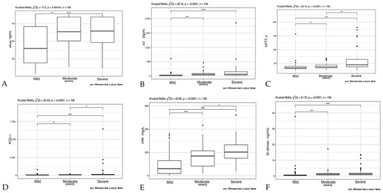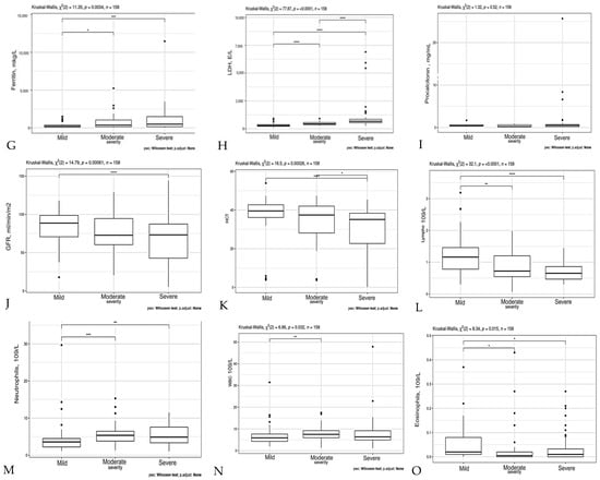 The results are presented as the arithmetic means ± standard deviation for the sample volume n (M ± m) and in terms of the median and the first quartile. The significance level was evaluated as * p < 0.05; ** p < 0.01; *** p < 0.001; and **** p < 0.0001. Statistical data processing (descriptive statistics and graphical analysis of data relationships from different tables) was performed using the GraphPad application on the Prism 8.01 platform. The frequency characteristics of qualitative indicators (gender, degree of form and pathological processes, and complaints) were evaluated using nonparametric methods, χ2. A Fisher’s exact test was used to compare mortality and disease severity in groups. Differences between groups were identified using the Kruskal–Wallis test and the Mann–Whitney test as a post hoc analysis [63].