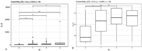 IL-6 (A) and PLA2 (B) levels in patients depending on the severity of the COVID-19 infection according to CT data. The numbers 0, 1, 2, and 3 indicate the degree of lung damage according to CT. The results are presented as medians and confidence intervals. The significance levels evaluated as * p < 0.05; ** p < 0.01; *** p < 0.001; and **** p < 0.0001.