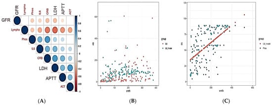 Correlation coefficients of the biochemical analytes in patients with COVID-19 (A) and multiple regression model for IL-6 (B) and PLA2 (C) levels.