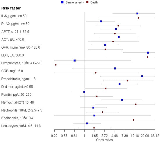 The results presented in Figure 4 show that increased levels of LDH, IL-6, and procalcitonin are the factors most predictive of the development of a severe or fatal COVID-19 infection in patients. Elevated levels of PLA2, ACT, D-dimer, APTT, and hemocrit also predicted a severe or fatal COVID-19 infection in patients, with odd ratios of 2.24, 5.46, 5.68, 4.71, 6.39 and 5.32, 4.14, 2.85, 4.51, 12.81, respectively. A combination of elevated levels of PLA2 and IL-6 increased the risk of a severe infection and death of the patients from COVID-19 by 20.0 and 9.68 times.