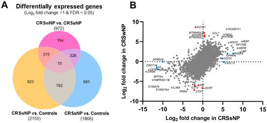 Venn diagram (A) and differential gene expression (B) in CRSwNP, CRSsNP, and controls. The proposed unique phenotype-associated DEGs with the highest differential expression in one of the phenotypes are presented in red (●) for CRSwNP and blue (●) for CRSsNP.