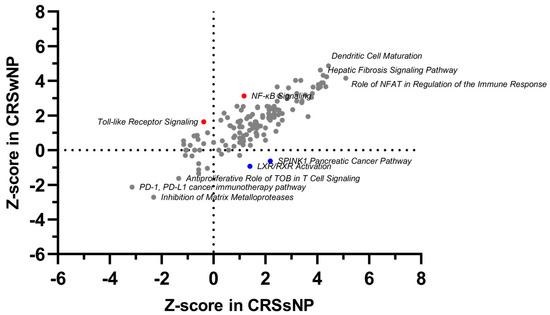 Comparison of enriched canonical pathways in CRSwNP and CRSsNP. The plot is based on the Z-score calculations obtained for a given set of genes using QIAGEN’s Ingenuity® Pathway Analysis (IPA®, QIAGEN, www.qiagen.com/ingenuity (accessed on 20 November 2021)). A positive Z-score represents strongly activated (Z-score > 2) pathways, and a negative Z-score represents significantly inhibited (Z-score < −2) pathways. Proposed unique phenotype-associated pathways are presented in red (●) for CRSwNP and in blue (●) for CRSsNP. Details in Supplementary Table S2 (Canonical pathways).