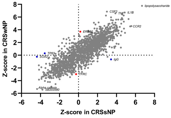 Comparison of enriched upstream regulators in CRSwNP and CRSsNP. The plot is based on the Z-score calculations obtained for a given set of genes, using the IPA analysis. A positive Z-score represents strongly activated (Z-score > 2) pathways, and a negative Z-score represents significantly inhibited (Z-score < −2) pathways. Proposed unique phenotype-associated pathways are presented in red (●) for CRSwNP and in blue (●) for CRSsNP. Details in Supplementary Table S3 (Canonical pathways).