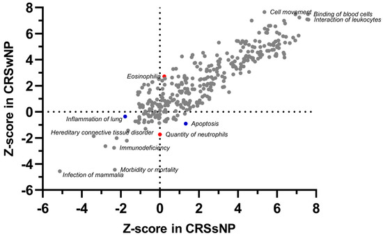Comparison of enriched diseases and functions in CRSwNP and CRSsNP. The plot is based on the Z-score calculations obtained for a given set of genes, using the IPA analysis. A positive Z-score represents strongly activated (Z-score > 2) pathways, and a negative Z-score represents significantly inhibited (Z-score < −2) pathways. Proposed unique phenotype-associated pathways are presented in red (●) for CRSwNP and blue (●) for CRSsNP. Details in Supplementary Table S4 (Diseases and functions).
