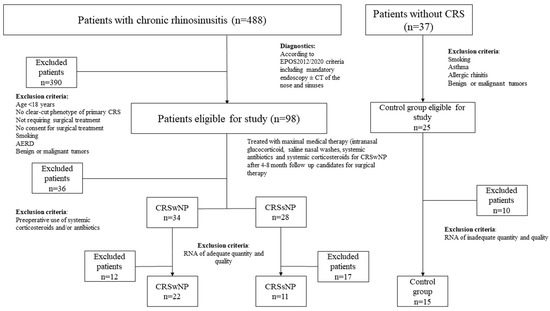 The study was designed as a prospective cohort study of 488 patients with CRS diagnosed and treated at a tertiary institution in Slovenia, responsible for managing the most burdensome patients. Ninety-eight eligible patients with a clear-cut phenotype of primary CRS (CRSwNP and CRSsNP) were identified [1,2]. All required surgical treatment and were older than 18 years. Patients with significant comorbidities such as aspirin-exacerbated respiratory disease (AERD), active smoking (smoking in the last year), a recent history of treatment with oral steroids or antibiotics (preoperative), confounding benign or malignant tumors, and a history of autoimmune diseases were excluded (n = 390). All patients had signed a written consent after a detailed explanation of the study design, the handling of their tissue samples, and the expected results, including the lack of direct and immediate effects of participation and study results on their treatment. The study was conducted according to the Declaration of Helsinki, and the National Ethics Committee approved the study (0120-297/2017/3 from 20 November 2017).