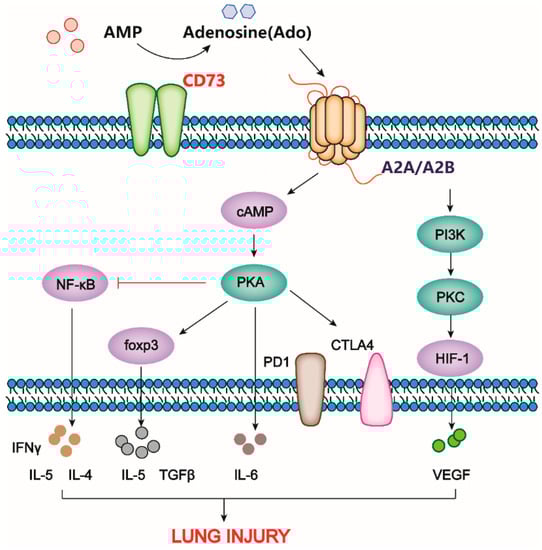 - Tian, Z.; Dixon, J.; Guo, X.; Deal, B.; Liao, Q.; Zhou, Y.; Cheng, F.; Allen-Gipson, D.S. Co-inhibition of CD73 and ADORA2B Improves Long-Term Cigarette Smoke Induced Lung Injury. Front. Physiol. 2021, 12, 614330. [Google Scholar] [CrossRef] [PubMed]