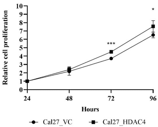 HDAC4 has previously been shown to induce cell proliferation in glioma, osteosarcoma, gastric-, esophageal-, and colon cancer, while it had only modest effects in urothelial carcinoma cell lines and multiple myeloma [,,,,,,]. To evaluate the effects of HDAC4 overexpression on cellular proliferation in the HNSCC line Cal27, MTT assays were performed over a period of 96 h (Figure 2). During the first 48 h after seeding, the HDAC4 clone grew similarly to the vector control cell line Cal27_VC. At 72 h and 96 h however, the HDAC4 overexpression clone Cal27_HDAC4 showed significantly increased proliferation compared to Cal27_VC.
