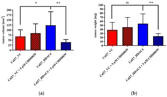HDAC4-induced promotion of cell proliferation in vitro (Figure 2) prompted us to elucidate in vivo effects of CHDI0039 on the proliferation of Cal27_HDAC4 in comparison to the control cell line Cal27_VC in the chorioallantoic membrane (CAM) model []. After transplantation of the tumor cells and subsequent compound incubation for 7 days, tumors were removed, measured and weighed (Figure 3). Cal27_HDAC4 tumors showed a significant increase in volume compared to Cal27_VC. Tumor weight was also increased but not significant. Treatment of Cal27_VC with 5 µM CHDI0039 had no significant effects on tumor volume and weight, while it caused a significant decrease in volume and weight of Cal27_HDAC4 tumors. An amount of 5 µM CHDI0039 completely inhibited class IIa HDAC enzymes, whereas class I HDACs was unaffected [].