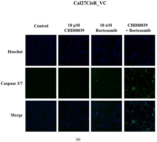 Compound-induced activation of caspases 3 and 7 was analyzed by using the CellEvent Caspase 3/7 green detection reagent (Invitrogen, Carlsbad, CA, USA) according to the manufacturer’s instructions. Briefly, Cal27, and Cal27CisR clones were seeded in 96-well plates (Corning, NY, USA) at a density of 4000 cells per well. Cells were treated 24 h after seeding with indicated concentrations of CHDI0039 and bortezomib. After a further incubation period of 24 h, medium was removed and 50 µL of CellEvent Caspase 3/7 green detection reagent (2 µM in PBS supplemented with 5% heat inactivated FBS) was added. Cells were incubated for 30 min at 37 °C in a humidified incubator before imaging by using the Thermo Fisher ArrayScan XTI high content screening (HCS) system (Thermo Fisher, Waltham, MA, USA). An amount of 8µM Hoechst 33342 (Sigma-Aldrich, Steinheim, Germany) was used for nuclei staining.