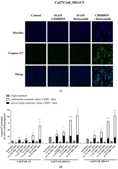 Representative fluorescent images of various Cal27CisR cell clones either untreated (control) or treated with 10 µM CHDI0039, or 10 nM bortezomib, or the combination thereof for 24 h. Hoechst 33342 (“Hoechst”, blue color) was used as nuclear staining and CellEvent Caspase-3/7 green detection reagent (green color) was used for caspase 3/7 activation. (a) Cal27CisR_VC cells. (b) Cal27CisR_HDAC4 cells. (c) Cal27CisR_HDAC5 cells. (d) Caspase 3/7 activation by single treatment and combinations of different concentrations of CHDI0039 (CHDI) and 10 nM bortezomib (Bort) in Cal27CisR_VC, Cal27CisR_HDAC4, and Cal27CisR_HDAC5. Cells were incubated with CHDI0039, bortezomib, or a combination thereof for 24 h. An amount of 0.5 µM Staurosporin was incubated for 8 h and served as positive control. Caspase 3/7 activation was analyzed by ArrayScan XTI. Data are the mean ± SD of two experiments, each with three replicates. Statistical analysis to compare the caspase 3/7 activation of the indicated treatments was performed using t-test. ns p > 0.05, * (p ≤ 0.05), ** (p ≤ 0.01), *** (p ≤ 0.001), **** (p ≤ 0.0001).