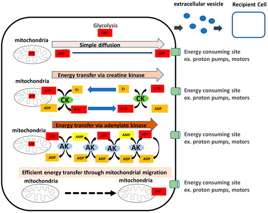 Model for high-energy phosphoryl transfer via adenylate kinase. As energy is transported from the mitochondria to the sites of utilization such as proton pumps or motors, the intracellular system supports an energy network of creatine kinase (CK), adenylate kinase (AK), and the localization or transport of the mitochondria themselves, in addition to simple diffusion. The presence of extracellular secretory AKs outside the cells suggests the existence of extracellular energy metabolism. In addition, intercellular energy networks, such as extracellular vesicles (EVs) are thought to exist.