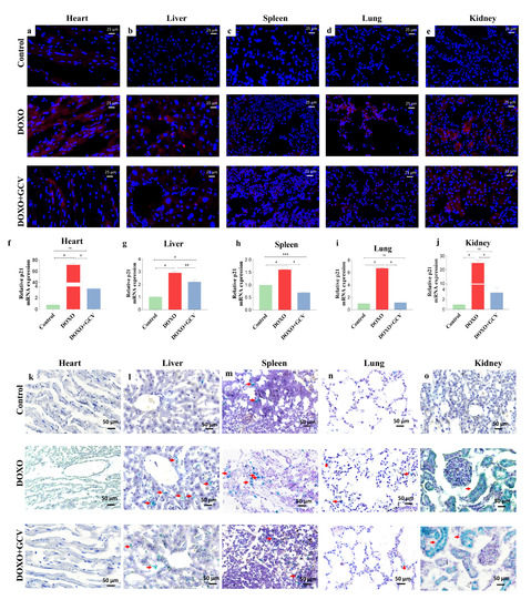 2.4. Clearance of p21high Cells Improves Histological Changes in Vital Organs