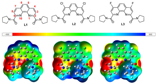 Another possible way to view the electronic distribution in the ligands L1–L3 is to use Merz-Kollman (ESP) charges [24]. For example, a difference in the corresponding charges on the nitrogen and oxygen atoms was observed for ligands L1–L3 according to the calculated data (Table 1). The differences in the charges on nitrogen and oxygen atoms are due to the fact that the ligand structures are asymmetric. Ligands of this type exist in twisted conformations (Figure 1, a single potential scale from −0.02 to +0.02 conventional units). All quantum chemical calculations were performed by DFT with functional—B3LYP and basis—6-31G (d,p), using the Gaussian 16 program [25] method. The calculated ESP charges in carbonyl oxygen and phenanthroline nitrogen atoms in ligands L1 and L3 look very similar; small differences in the values of the corresponding charges are observed only for the ligand L2 (Table 1).